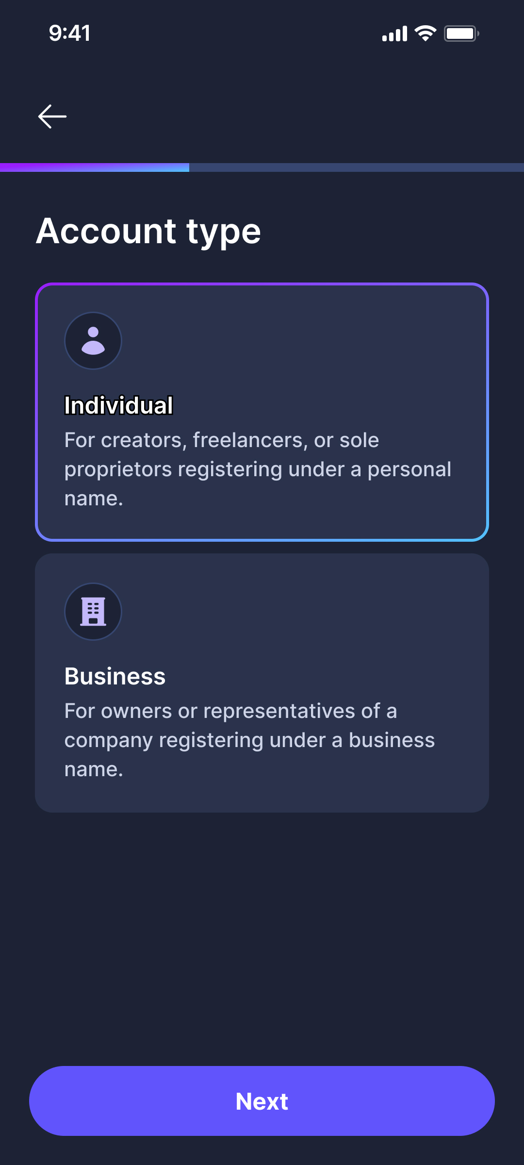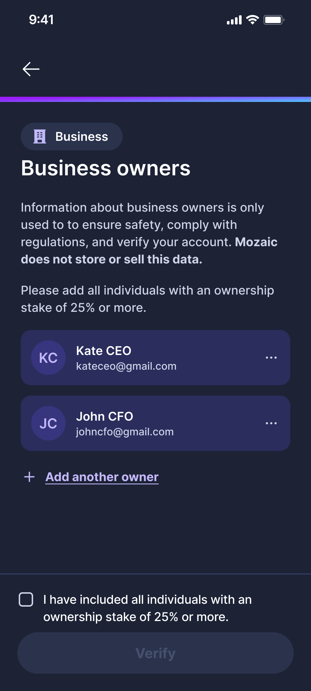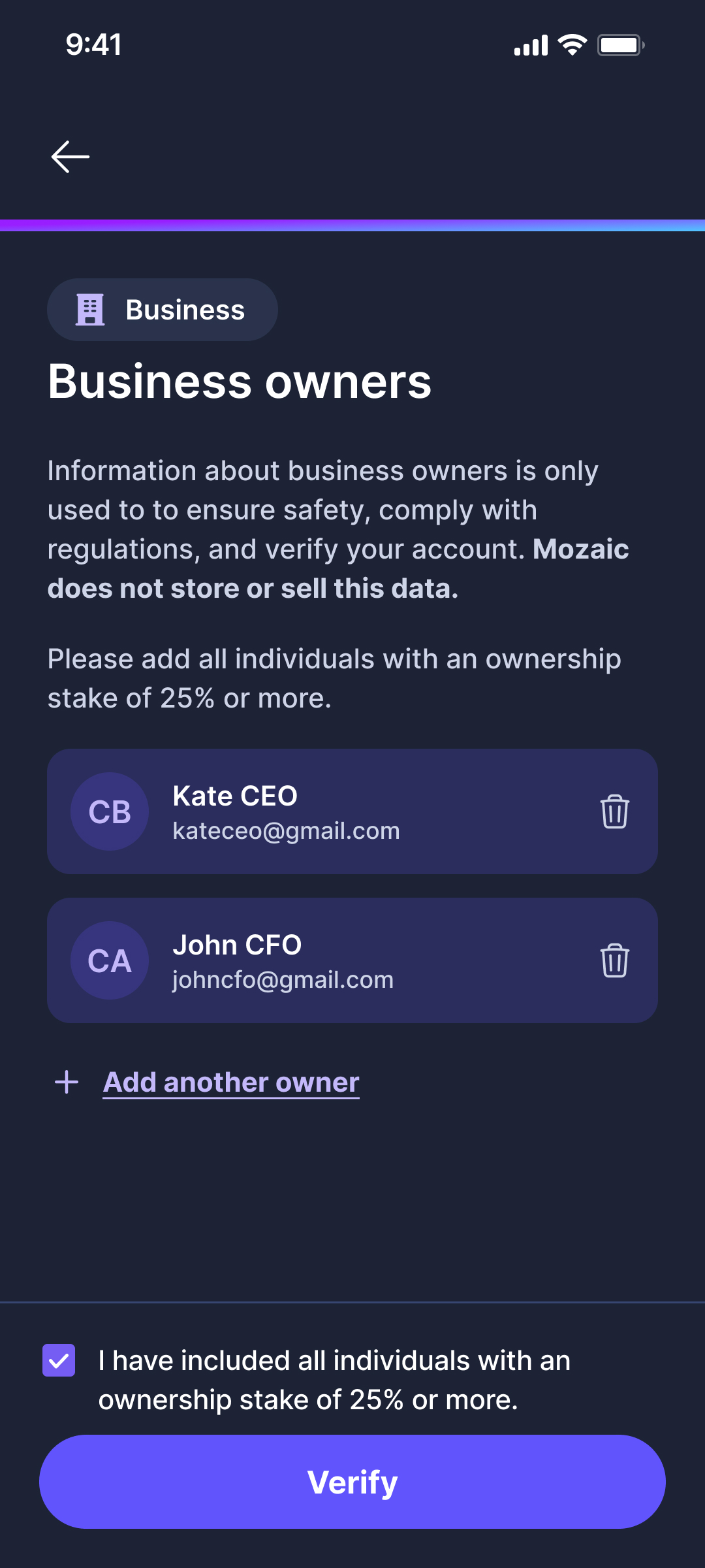 The Mozaic mobile app is designed to offer a seamless financial experience for both individual users and businesses. Users can easily sign up by selecting their account type and gain access to a range of core features. The app supports sending and receiving payments between users, making peer-to-peer transactions quick and convenient. It also allows users to securely link their bank accounts, credit cards, or debit cards to facilitate smooth financial operations. Additionally, Mozaic includes a split creation feature with integrated YouTube functionality, enabling users to manage shared payments or revenue splits ideal for content creators and collaborators.